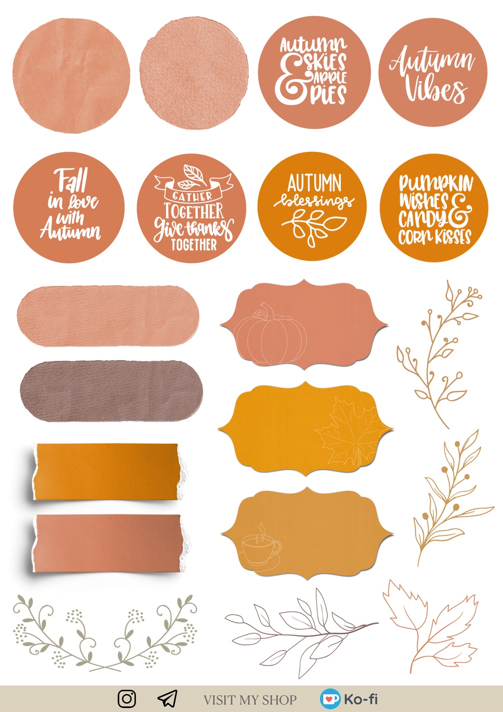 7 pages 100+ pre-cropped fall stickers with semitransparent overlay fall compositions, paper labels, line art leaves, seamless borders, dates etc. GoodNotes & PNG