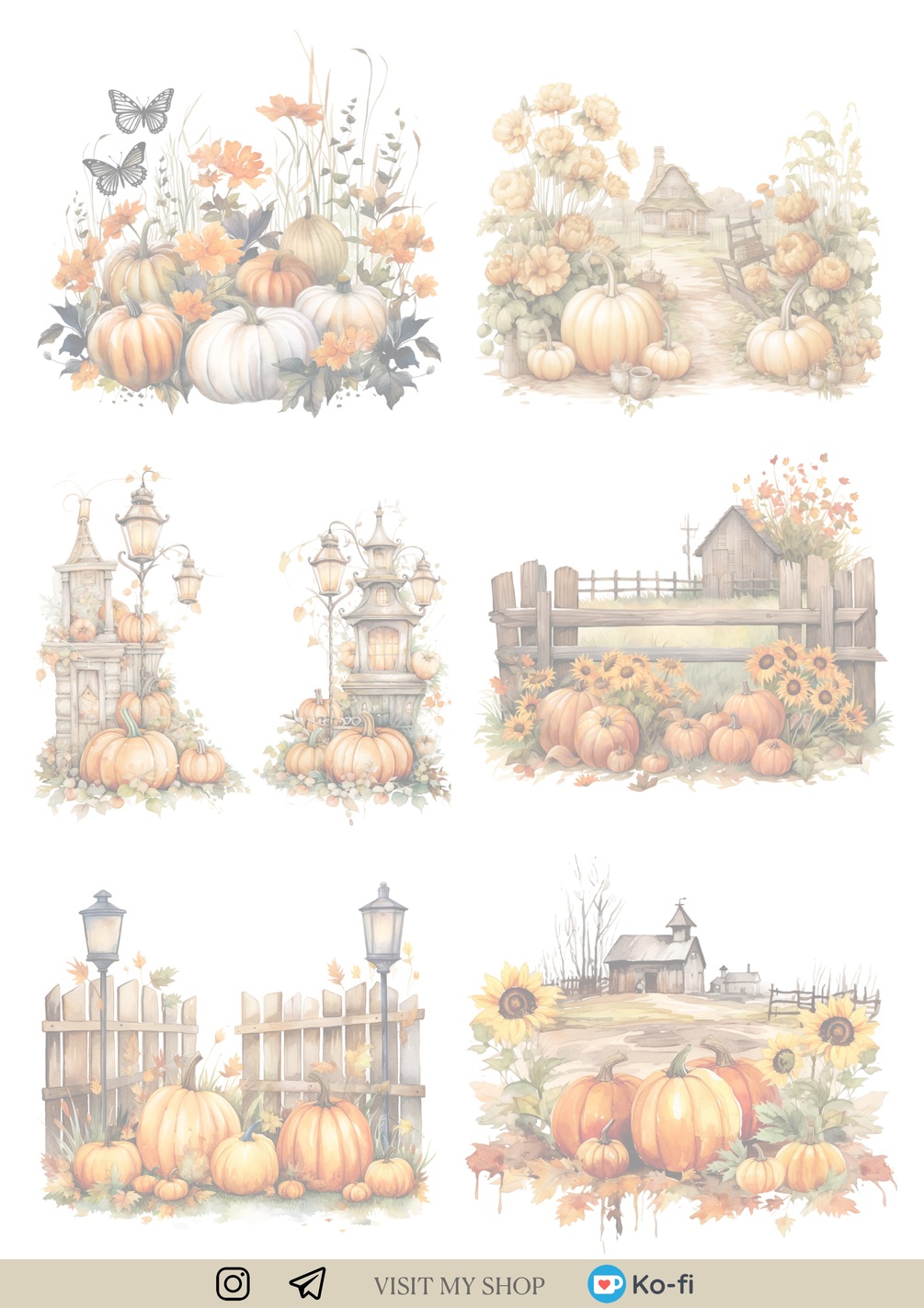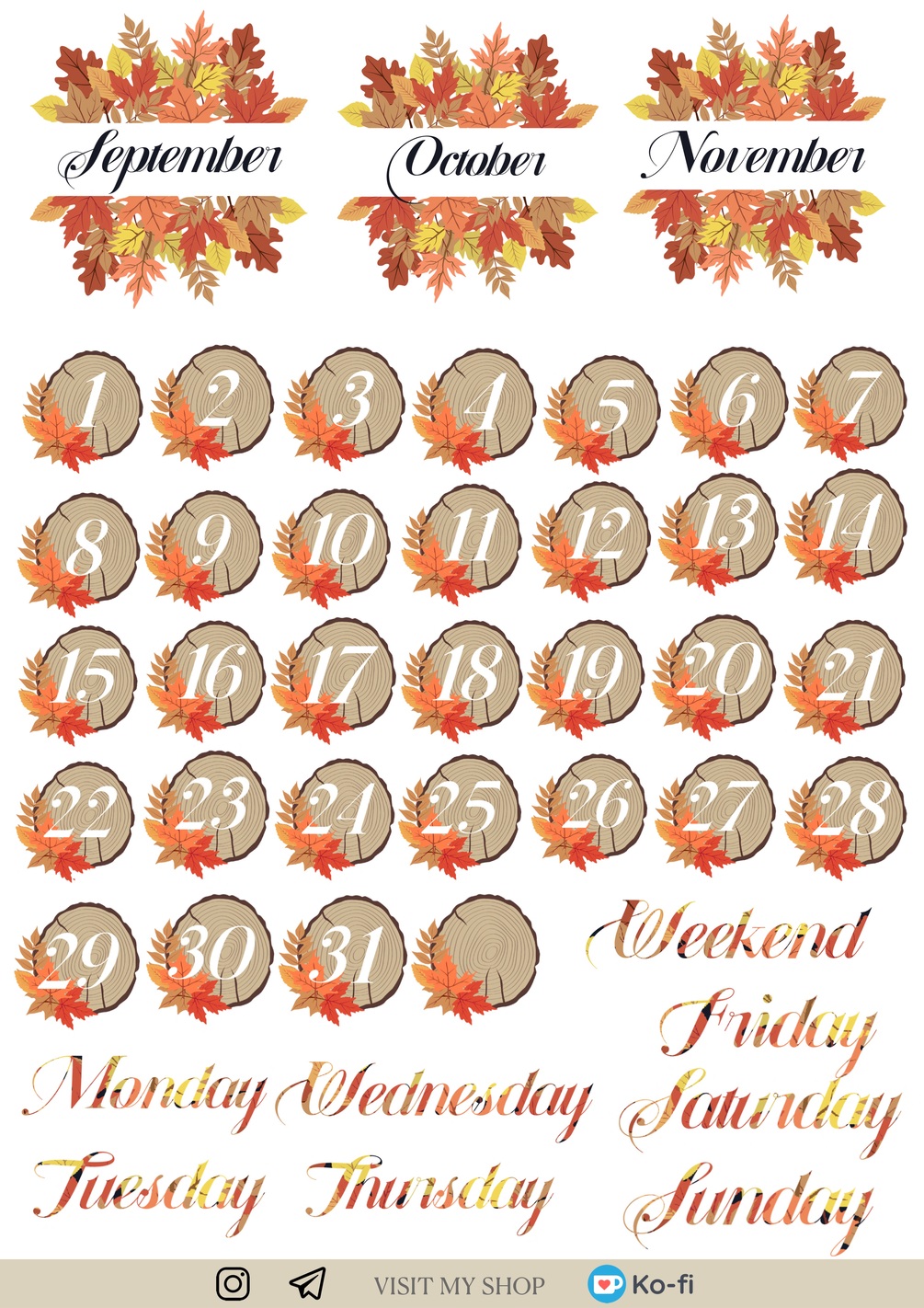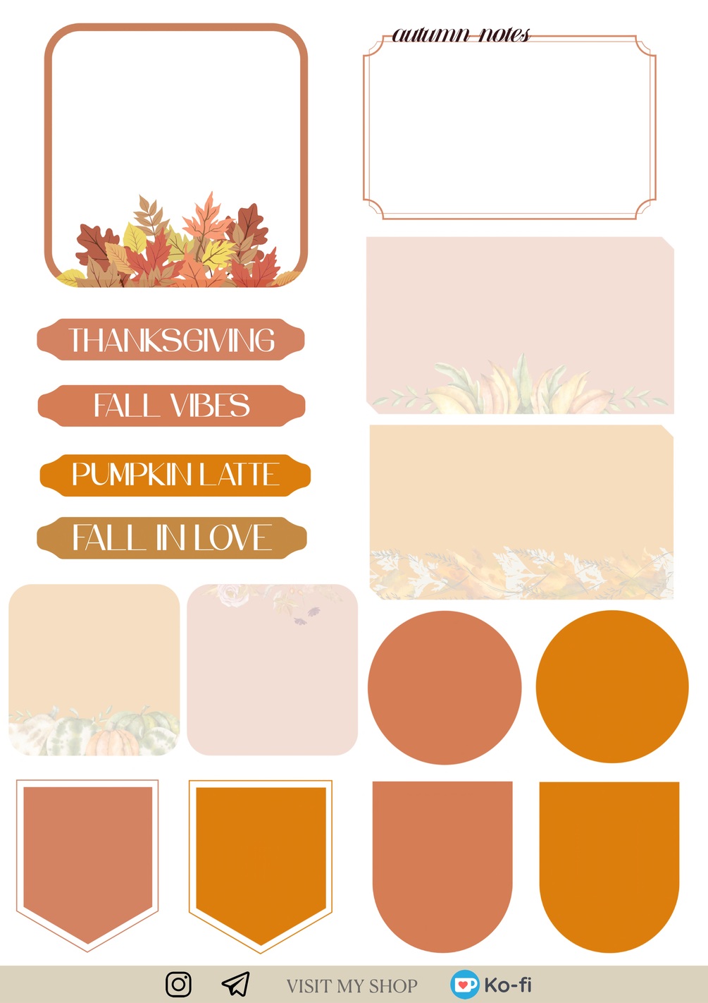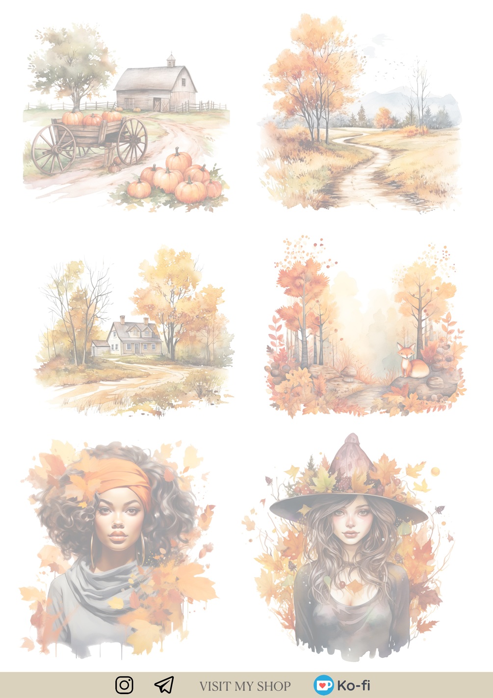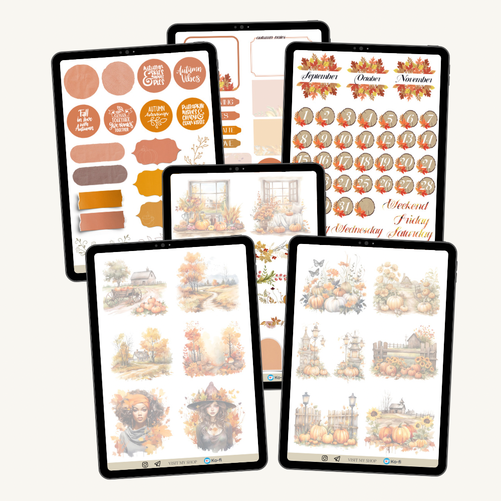7 pages 100+ pre-cropped fall stickers with semitransparent overlay fall compositions, paper labels, line art leaves, seamless borders, dates etc. GoodNotes & PNG