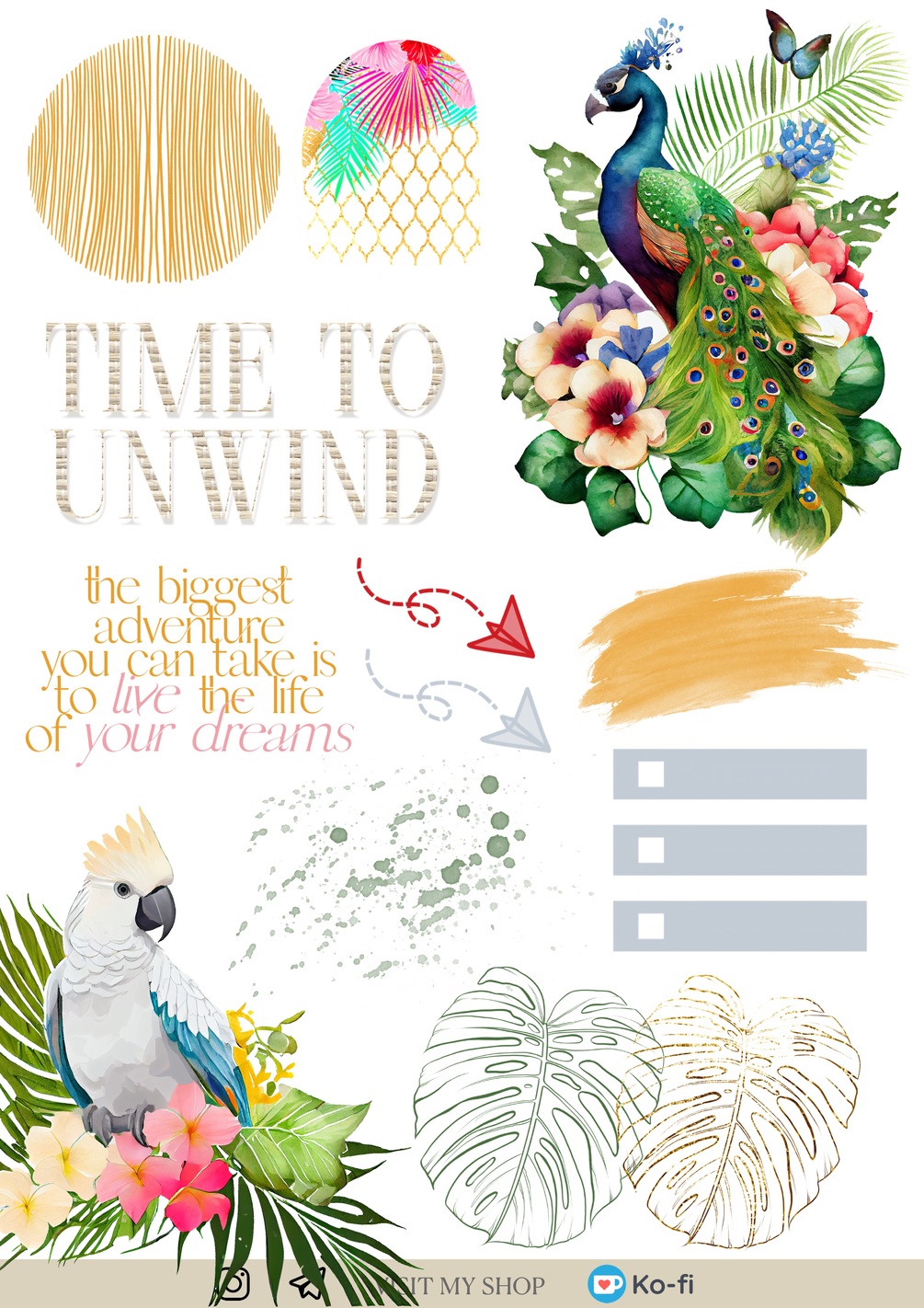 4 pages 50 pre-cropped summer vacation stickers with tropical birds, photo frames, splashes, words, labels, decorative and functional elements. GoodNotes ONLY