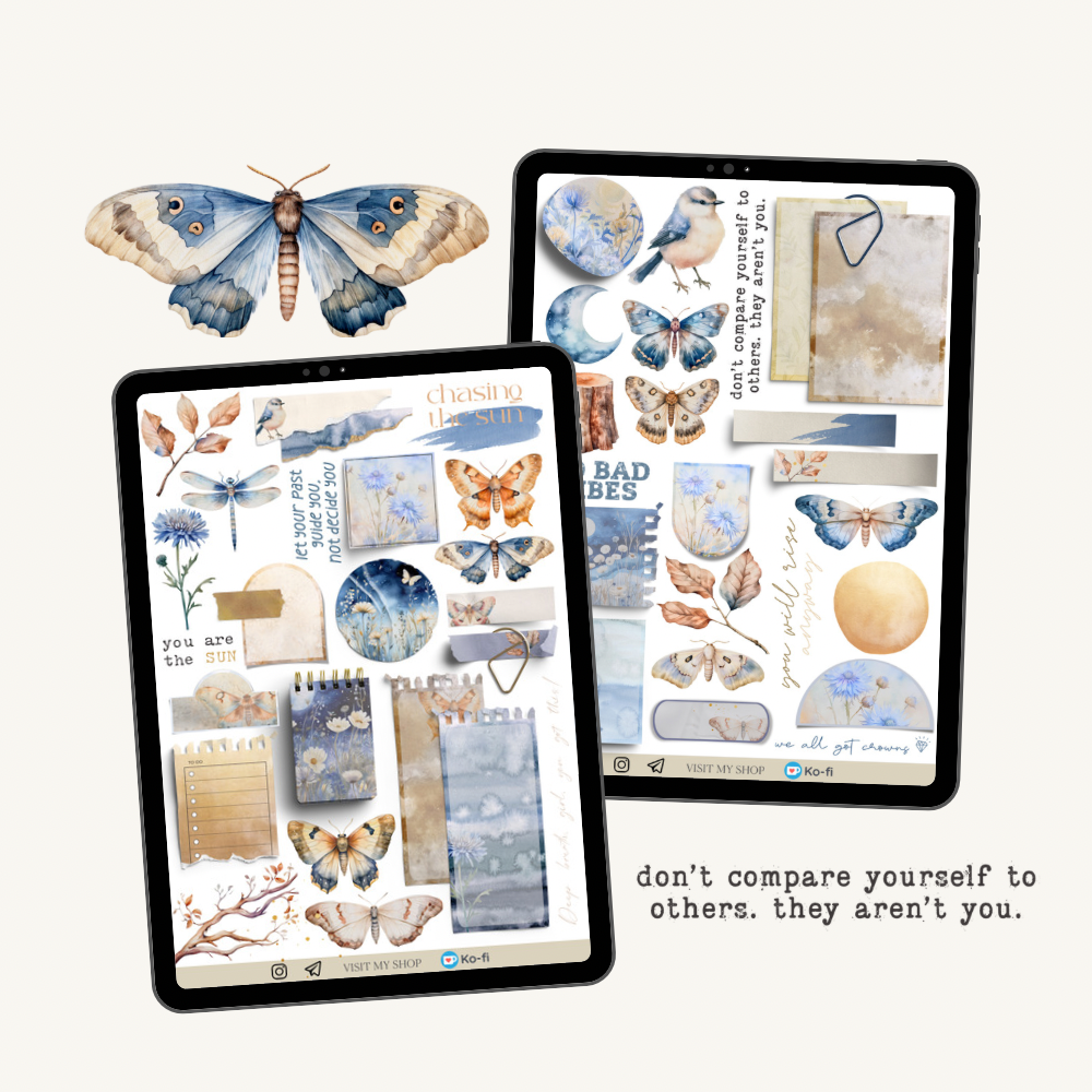 2 pages 52 pre-cropped blue and gold stickers with realistic paper stickers, watercolor elements and quotes.