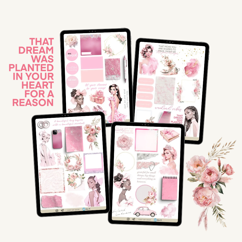 4 pages 62 pre-cropped pink stickers with girls, realistic paper elements and quotes.