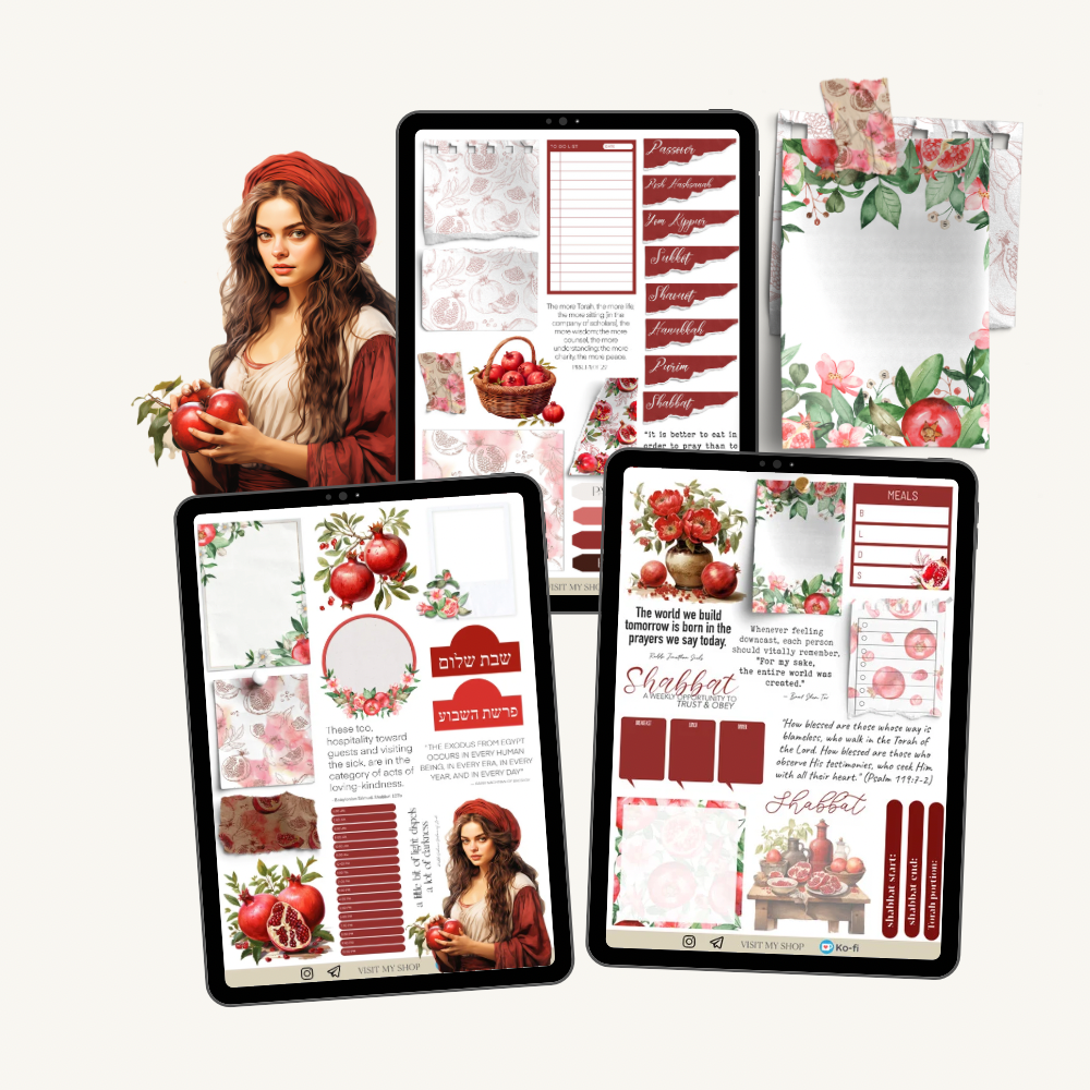3 pages 48 pre-cropped Jewish themed stickers with pomegranates, paper notes, quotes and Jewish holidays realistic paper labels.