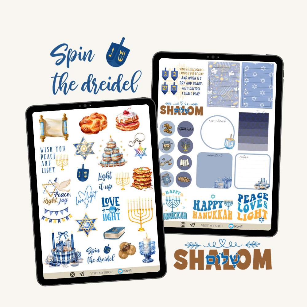 2 pages 40 pre-cropped decorative and functional Hanukkah stickers with paper notes, icons and Hanukkah symbols.