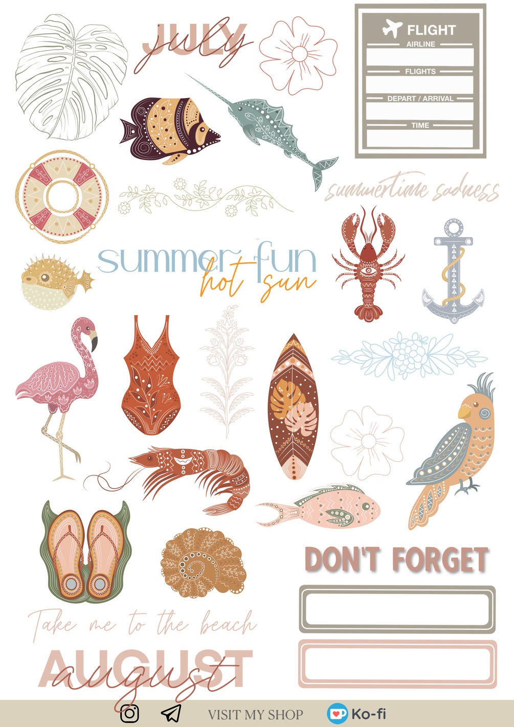2 pages 50 pre-cropped simple beige boho and folk summer stickers with decorative elements, summer things, birds and fishes, functional elements, summer words and quotes. GoodNotes ONLY