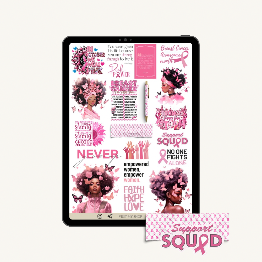 20 pre-cropped pink Breast Cancer Awareness Month stickers with girls and motivational quotes