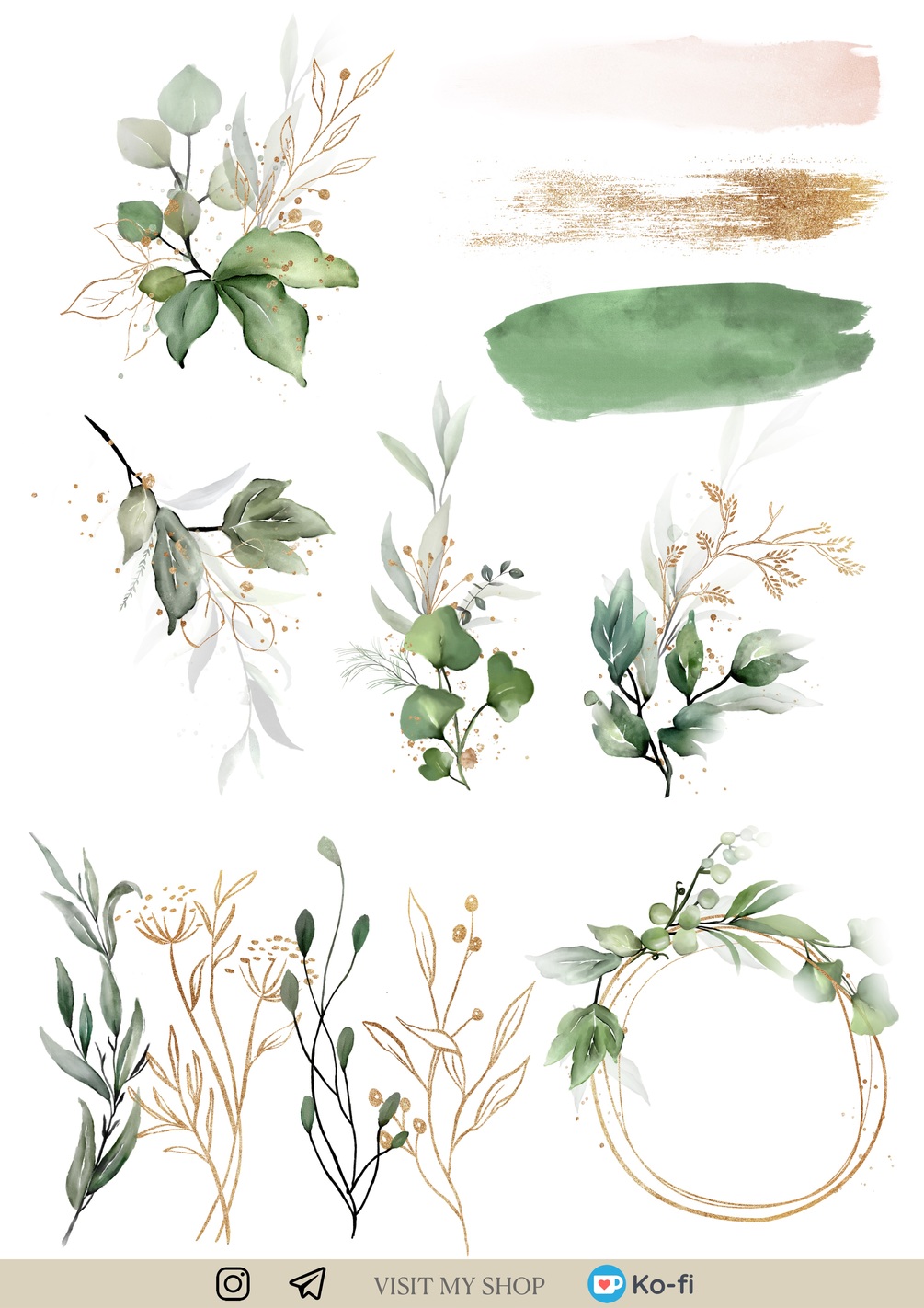 Sticker pack includes realistic paper sticker notes, Green and Gold leaves, brush strokes and decorative elements. GoodNotes file (3 pages, 30 pcs) + PNG!