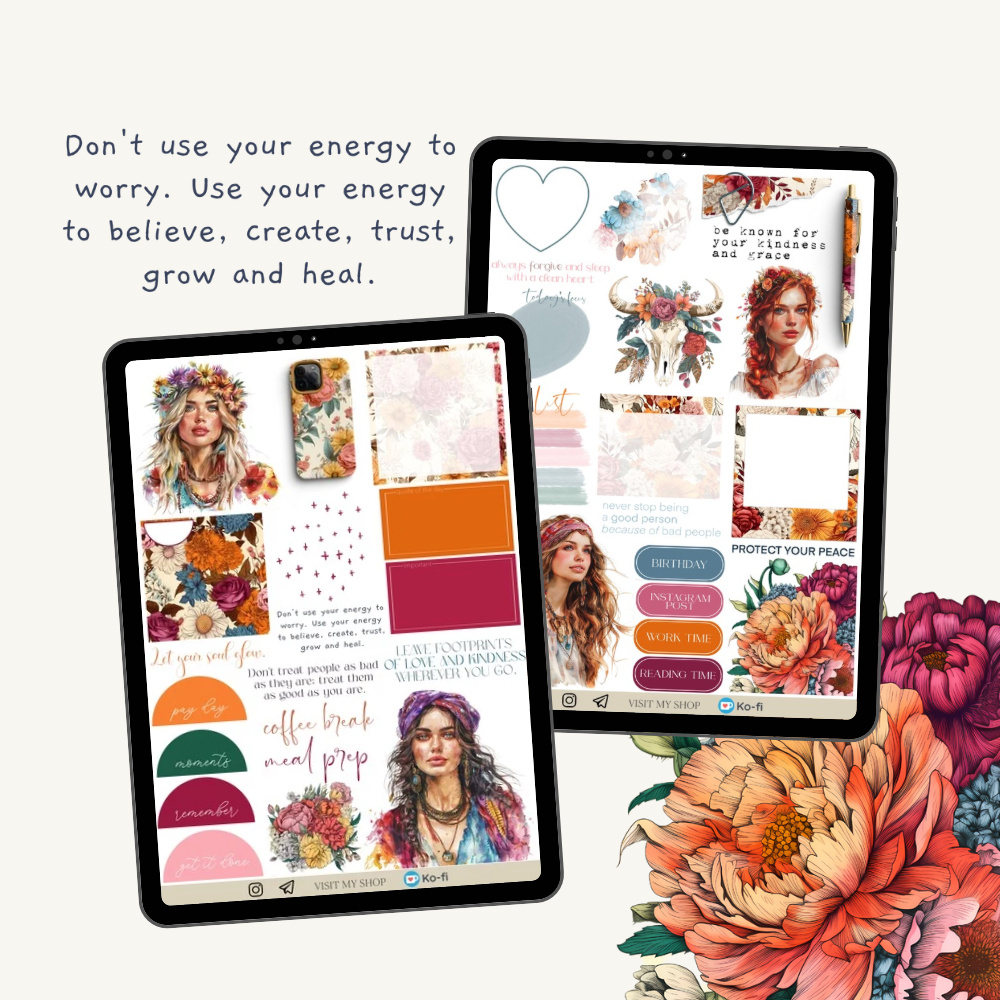 2 pages 40 pre-cropped bright boho stickers with flowers and functional elements.