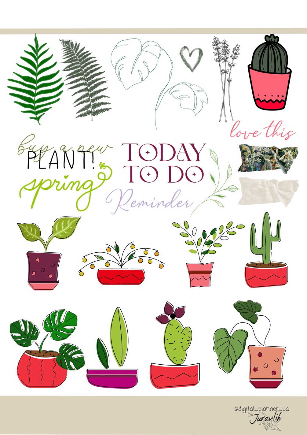 2 pages 45 pre-cropped functional and decorative plants stickers, GoodNotes ONLY.