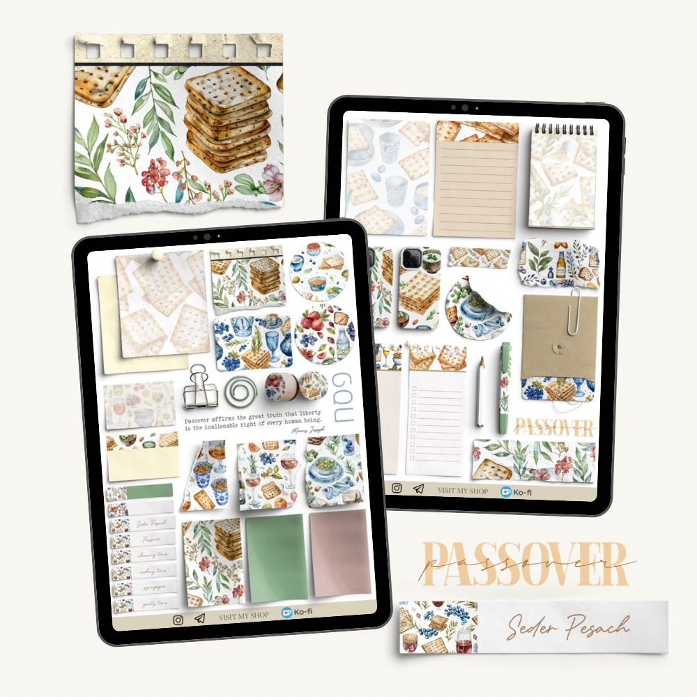 2 pages 44 pre-cropped Passover themed realistic paper stickers with paper notes, torn papers and decorative elements