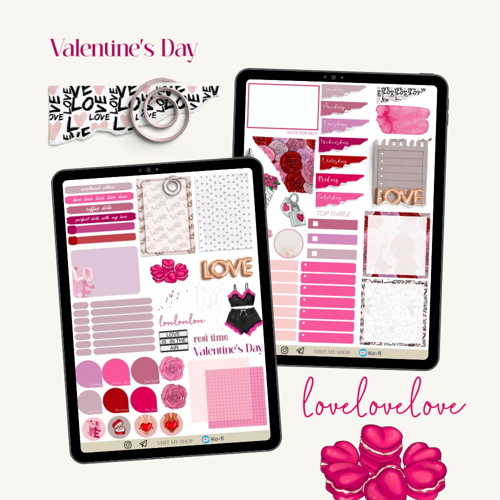 2 pages 56 pre-cropped pink stickers with labels, paper notes, lists and decorative Valentine’s Day elements