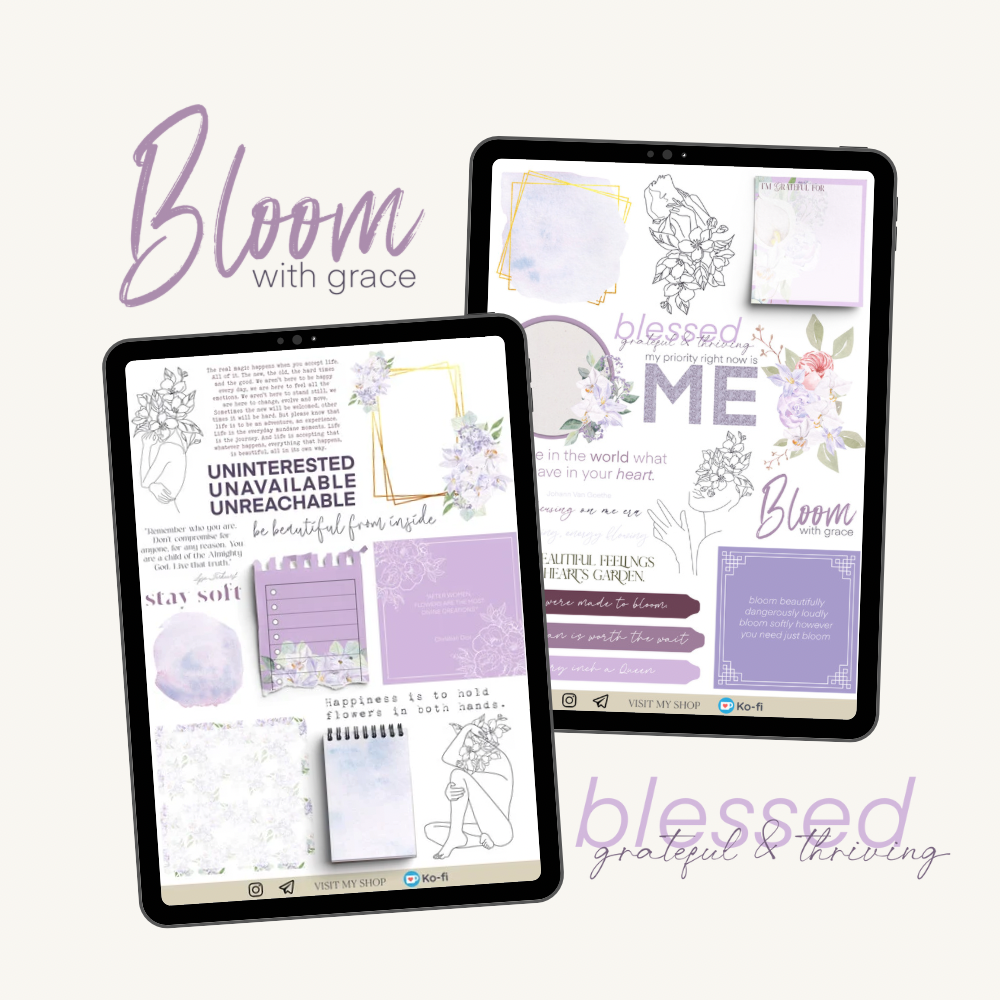 2 pages 30 pre-cropped very peri stickers with flowers, line art flower girls and quotes.
