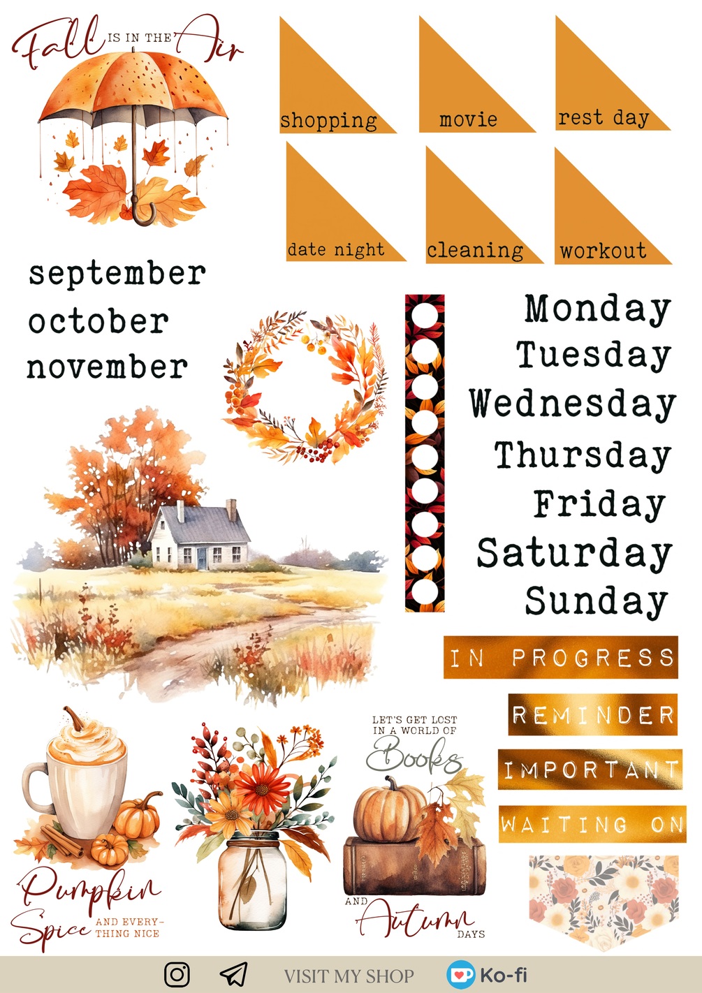3 pages 90 pre-cropped autumn decorative and functional stickers, GoodNotes ONLY