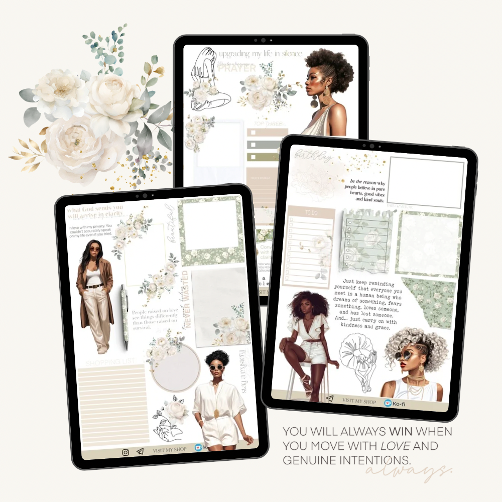 3 pages 52 pre-cropped delicate stickers with girls, flowers, quotes and sticker notes.