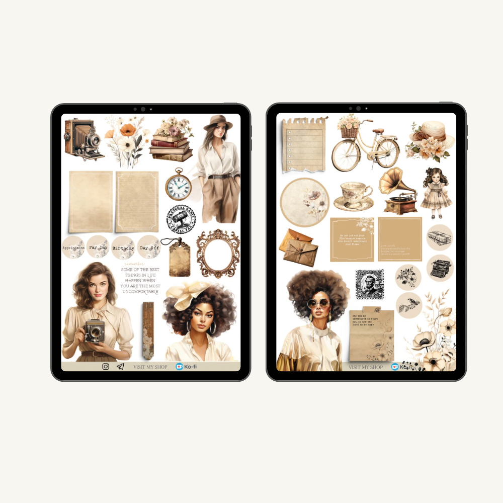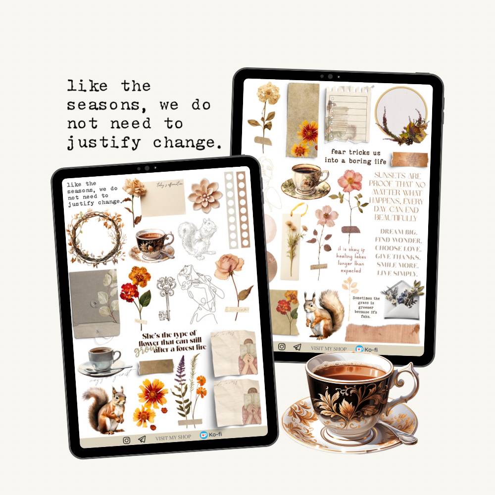 2 pages 42 pre-cropped retro style collage stickers with dry flowers, squirrels, tea cups and paper notes.
