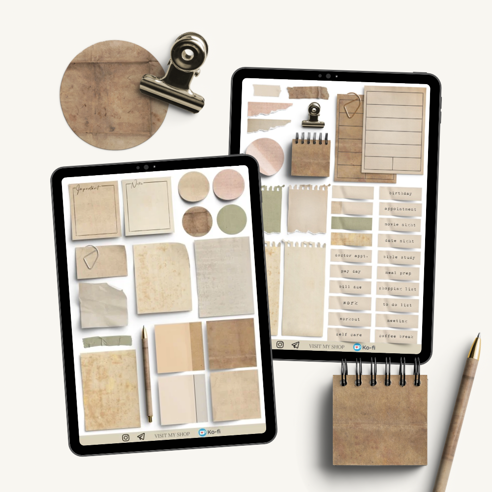 Vintage Paper stickers & Notebook, GoodNotes, PNG, PDF
