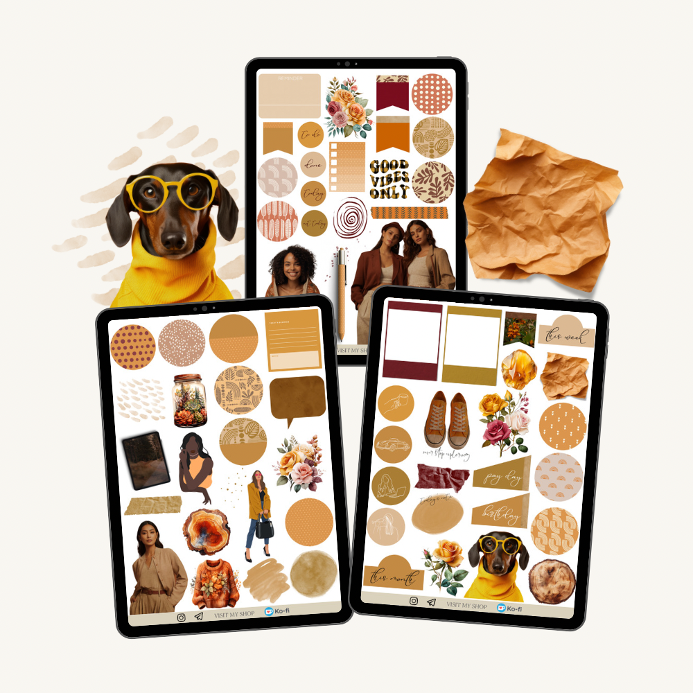 3 pages 66 pre-cropped mustard and yellow collage elements for planning and journaling with rounds, girls, icons, labels, flowers etc.