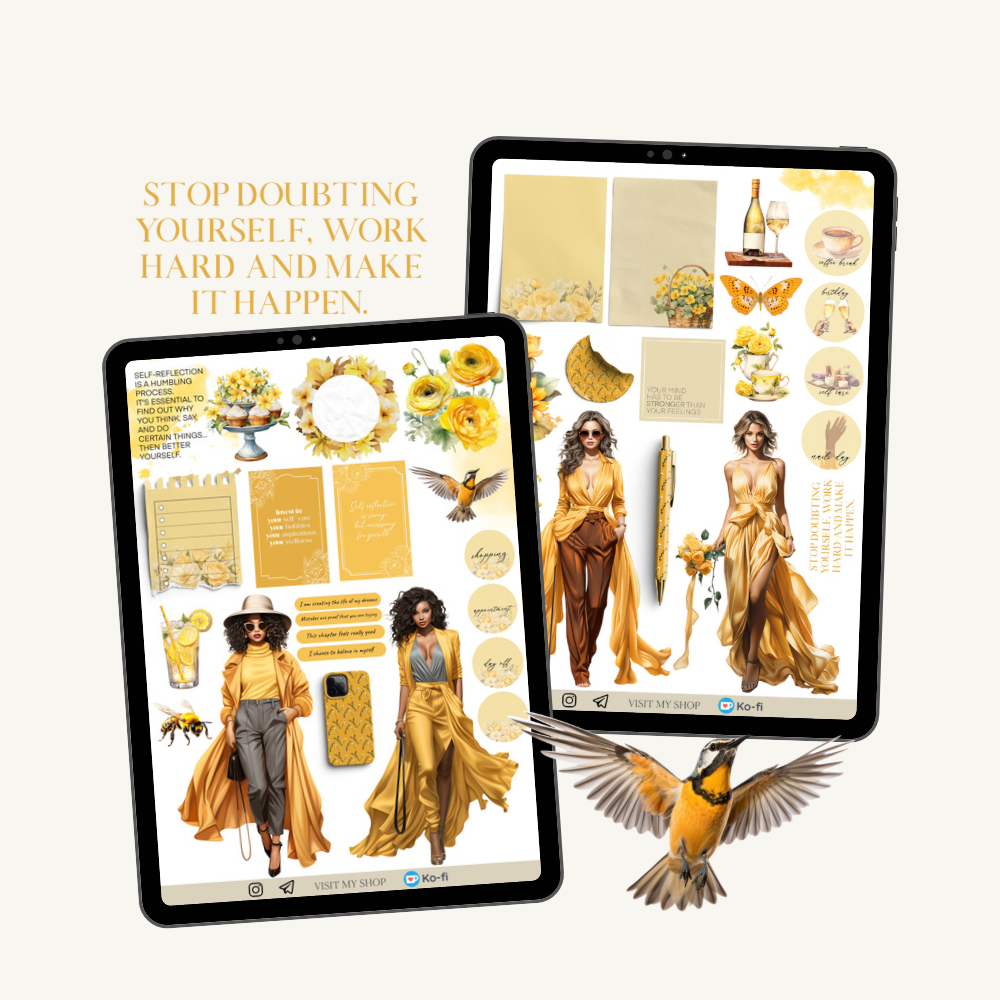 2 pages 40 pre-cropped yellow stickers with girls, icons, paper notes, quotes and yellow elements.