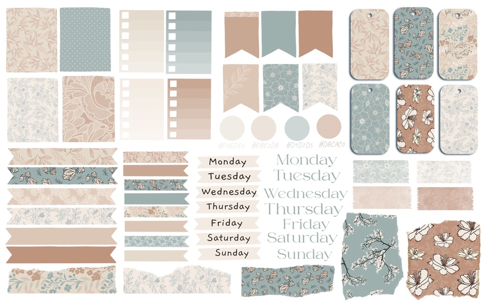 1 page 50+ pre-cropped pale brown, beige and light grey functional stickers with flowers and laces: labels, tags, torn paper, Washi tapes etc. plus HEX-codes for pen and highlighter