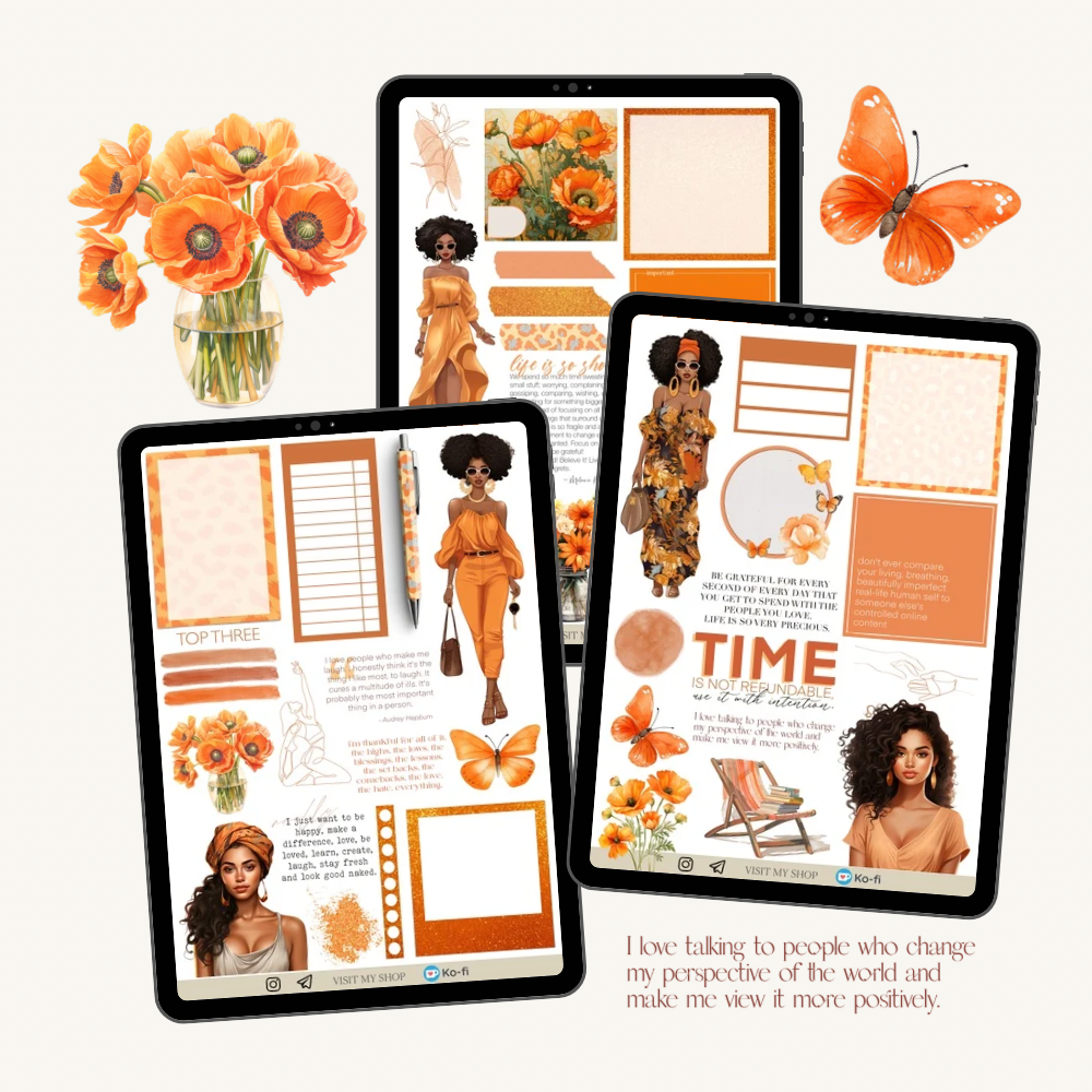 3 pages 42 pre-cropped orange stickers with girls, quotes and functional elements.