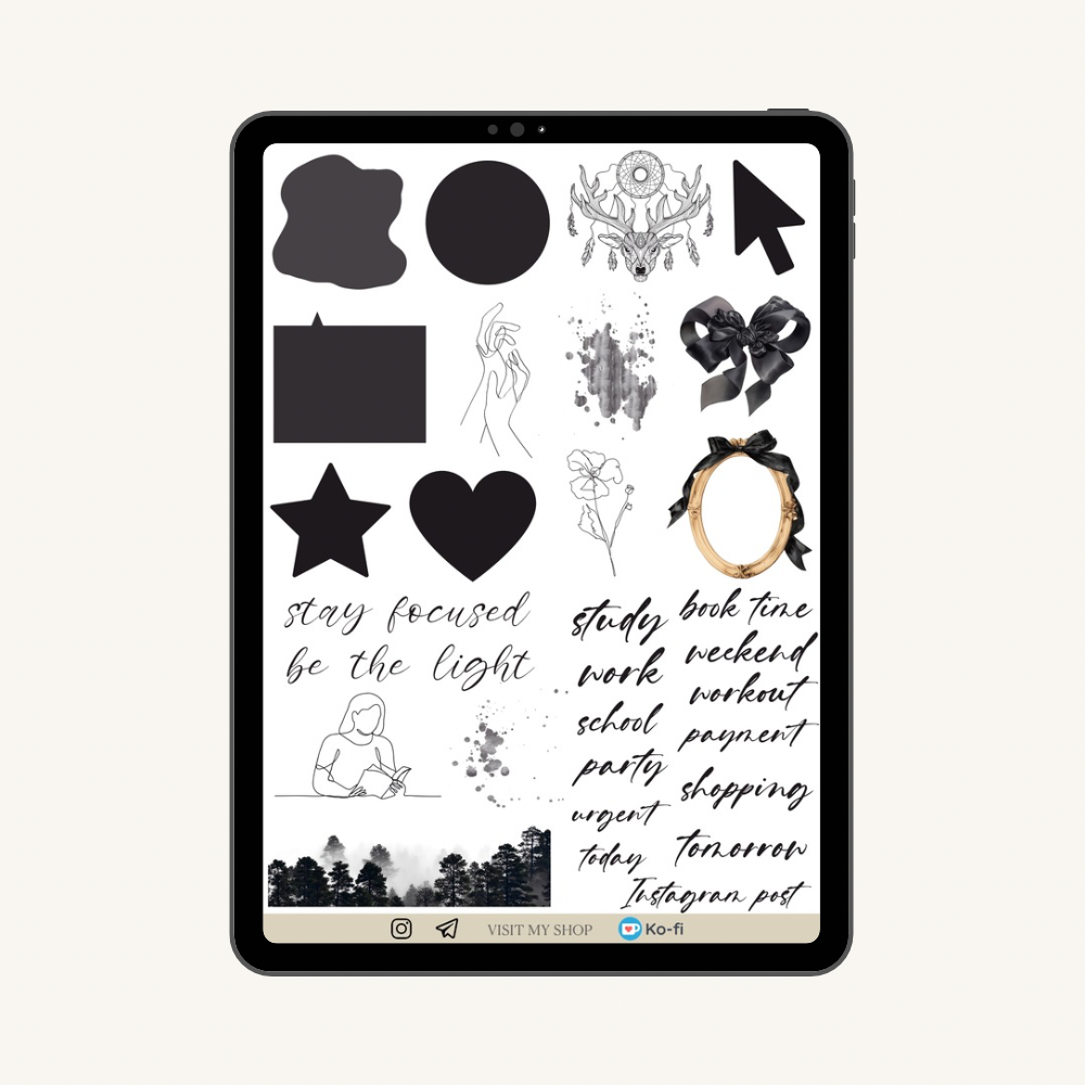 1 page 30 pre-cropped minimalistic black stickers with decorative and functional elements.