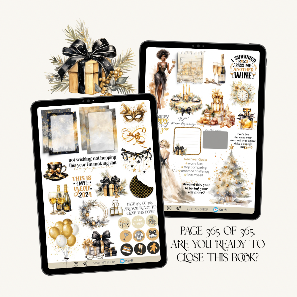 2 pages 44 pre-cropped black and gold New Year themed stickers with decorative elements, sticker notes, icons and quotes.