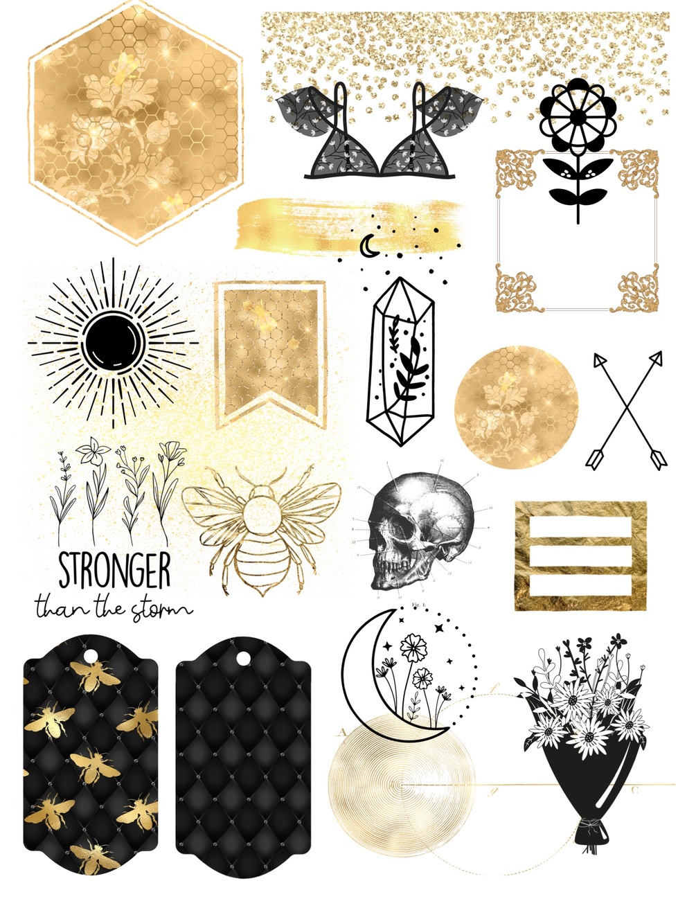 2 pages 36 pre-cropped black and gold decorative and functional honey bee themed stickers, GoodNotes ONLY