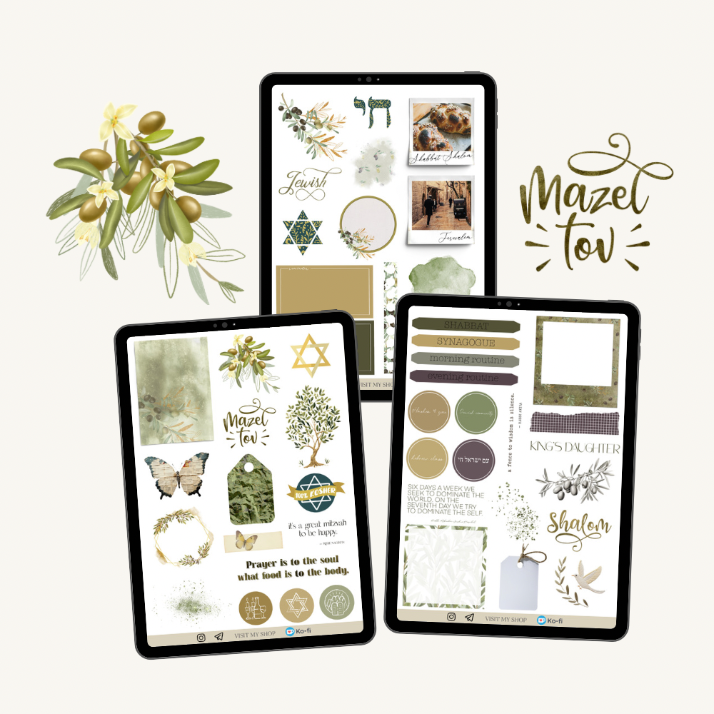 3 pages 48 pre-cropped Jewish themes stickers with olives, paper notes, words, quotes.