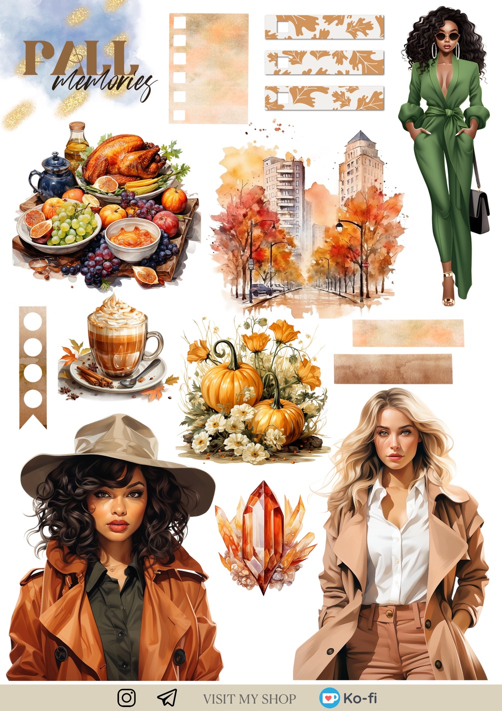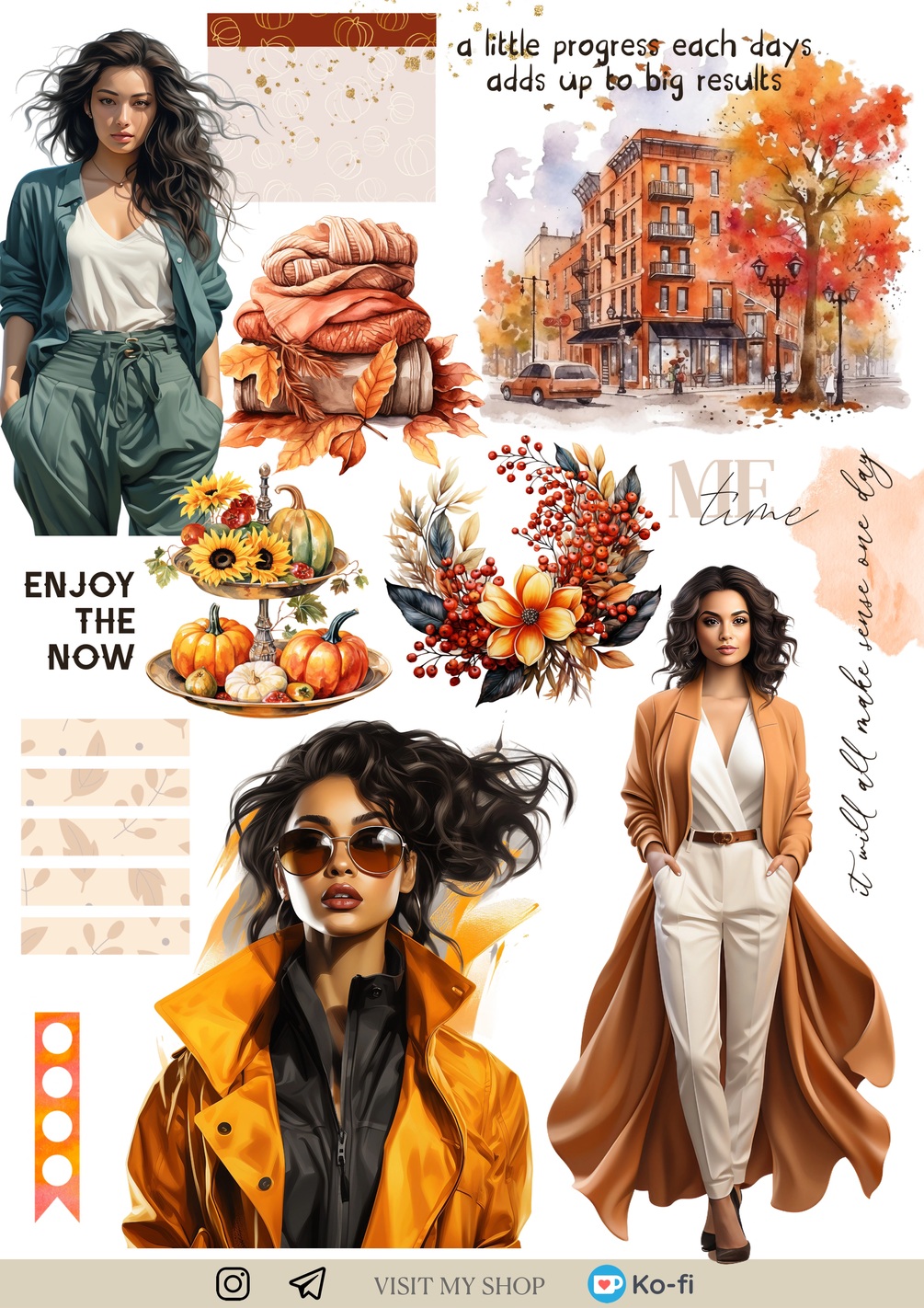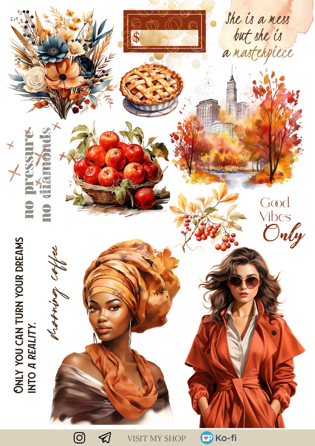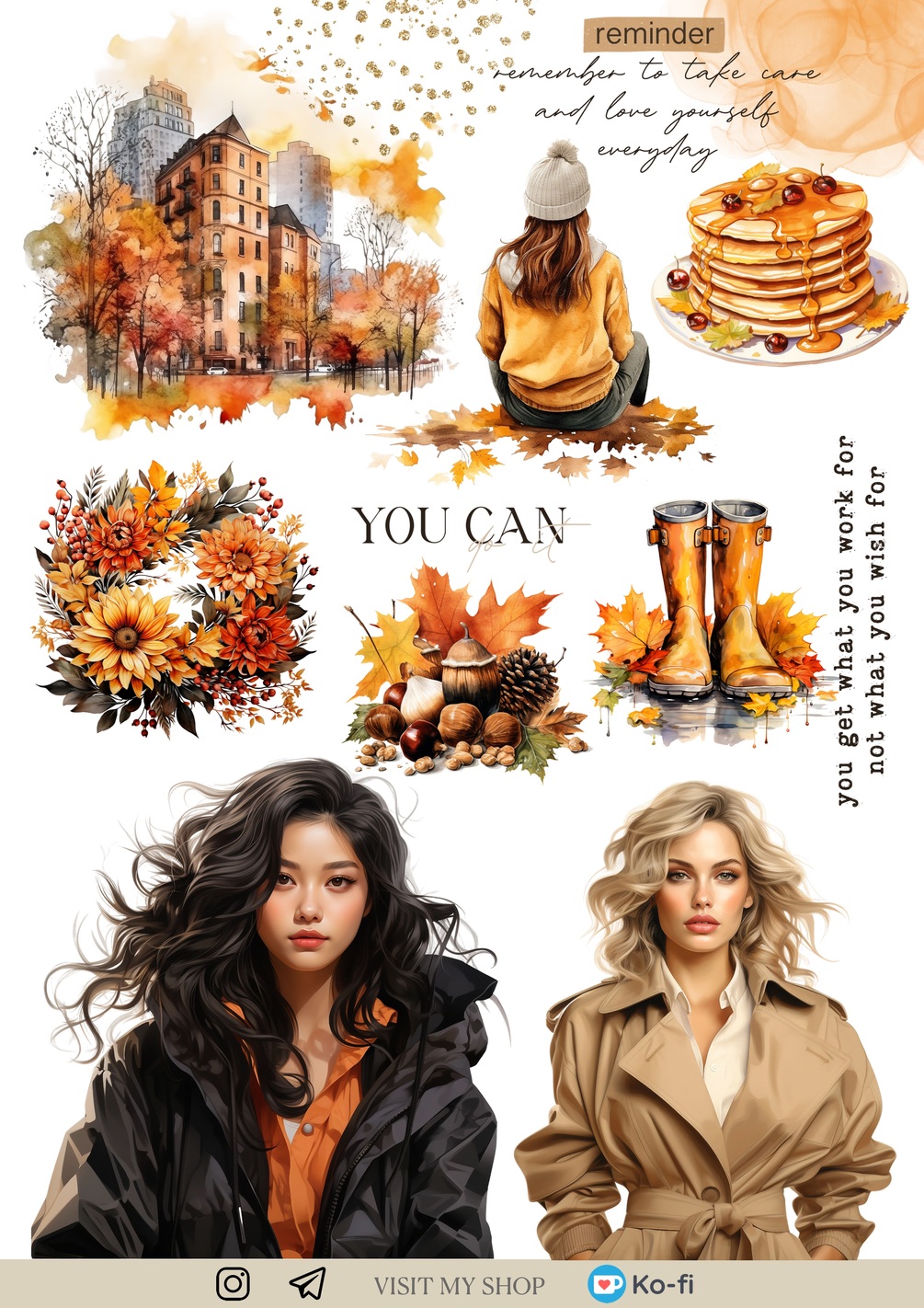4 pages 60 pre-cropped fall themed decorative, motivational and functional stickers with a stylish girls, harvest arrangements, fall streets, watercolour stains and other elements. GoodNotes ONLY