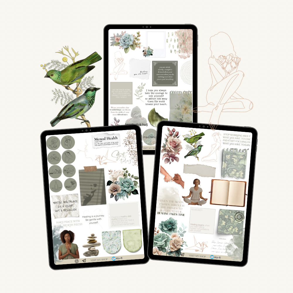 3 pages 63 pre-cropped pale green and beige stickers about mental health with icons, quotes, girls, papers, flowers and decorative elements for planning and journaling.