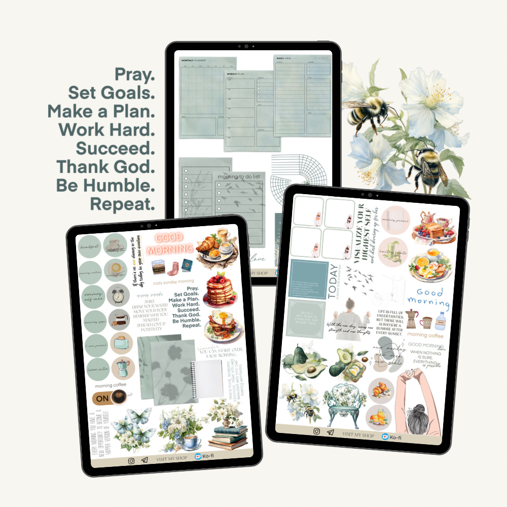 3 pages 65 pre-cropped light teal morning stickers with icons, paper notes, quotes, breakfast images, planning pages and decorative elements.