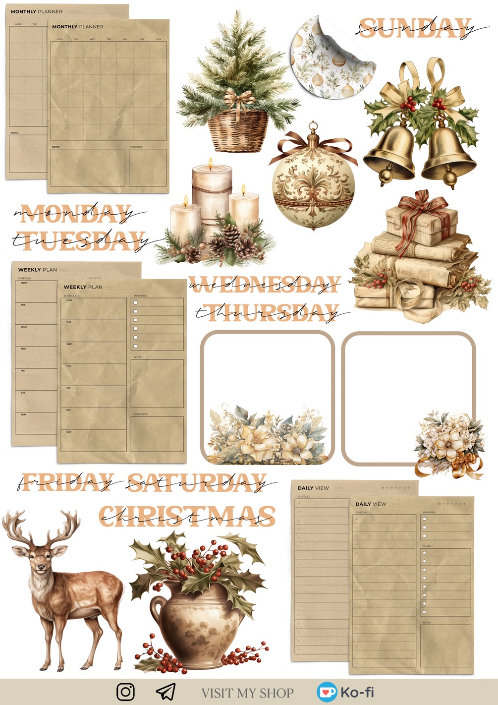 3 pages 85+ pre-cropped neutral vintage style Christmas stickers with elegant decorative elements, dates and realistic paper stickers.