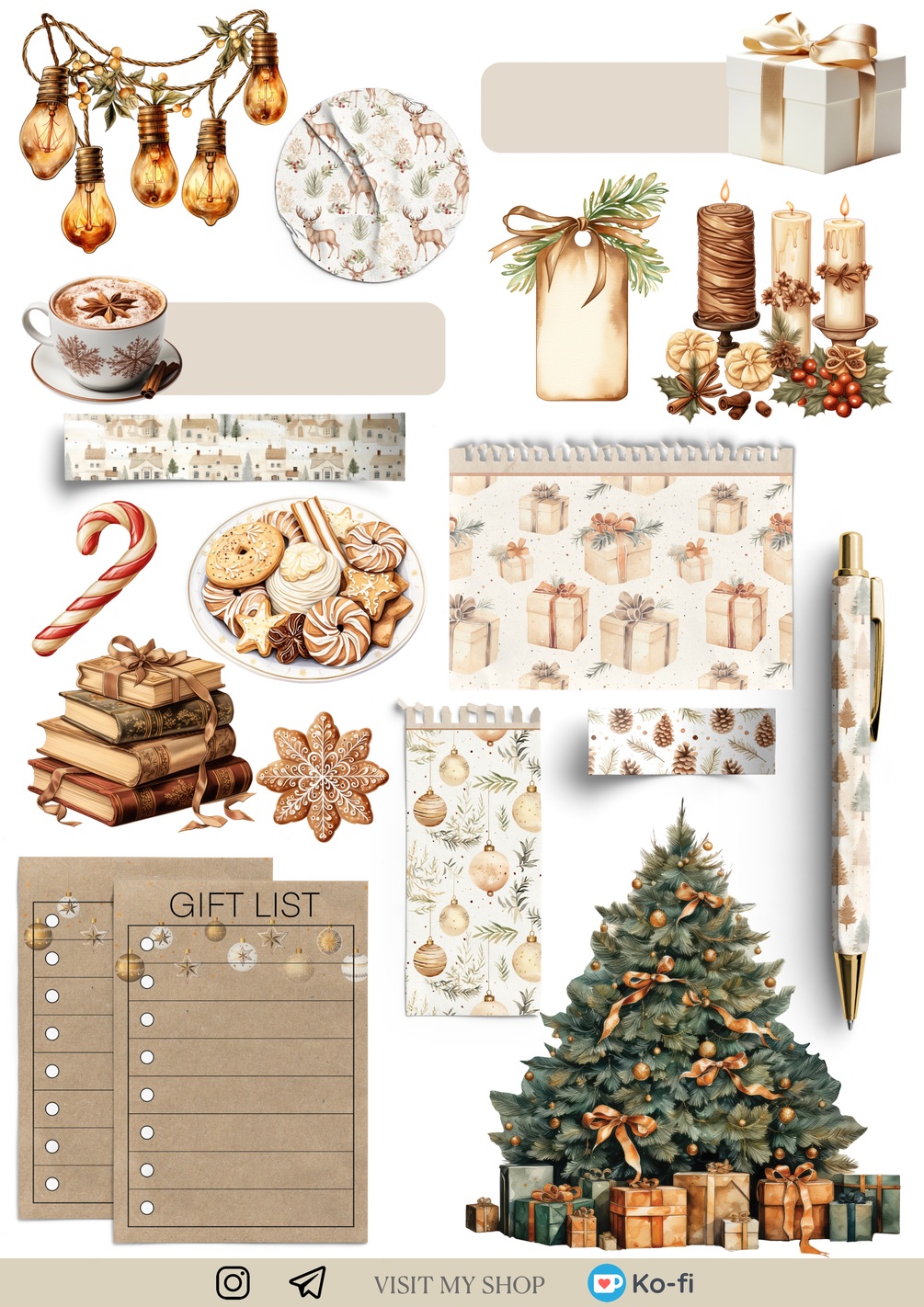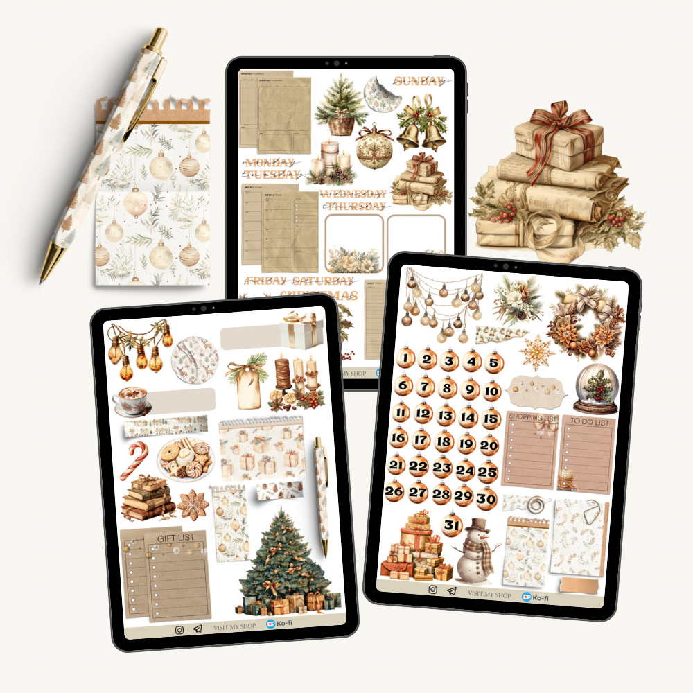 3 pages 85+ pre-cropped neutral vintage style Christmas stickers with elegant decorative elements, dates and realistic paper stickers.