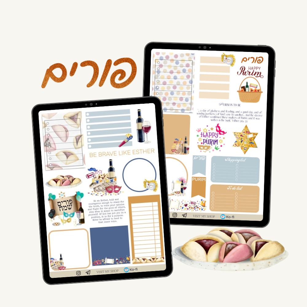2 pages 26 pre-cropped Purim stickers with paper notes, lists and decorative Purim elements.