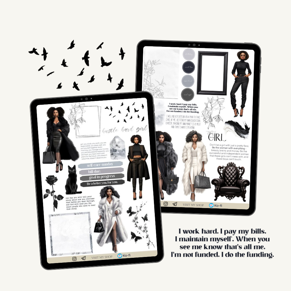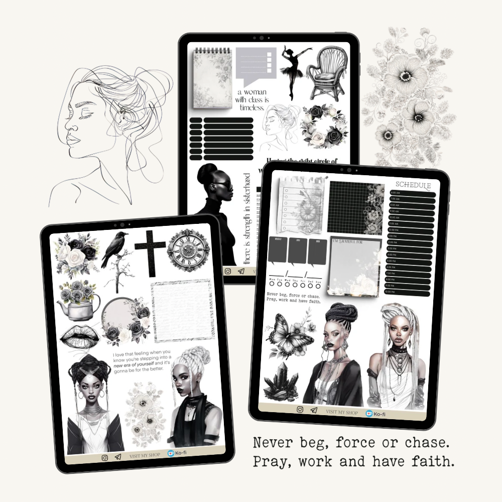 3 pages 36 pre-cropped black & white stickers with girls, functional and decorative elements.