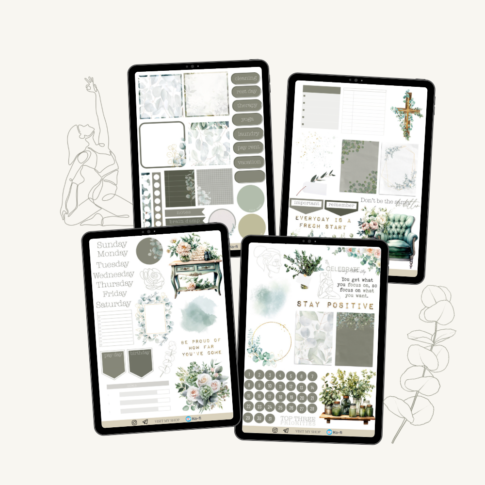 4 pages 100 pre-cropped eucalyptus functional stickers with dates, labels, paper notes, quotes etc.