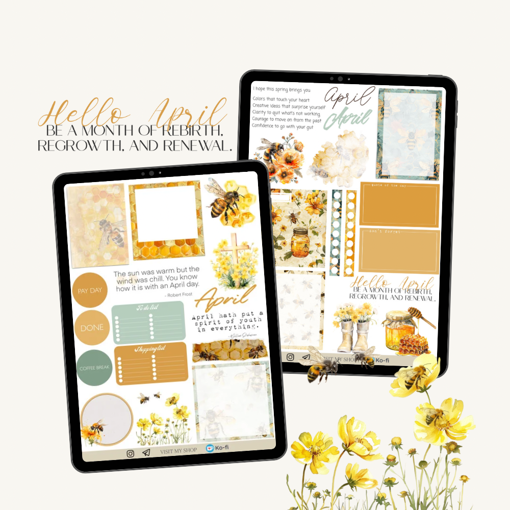 April Honey Bee stickers, GoodNotes & PNG