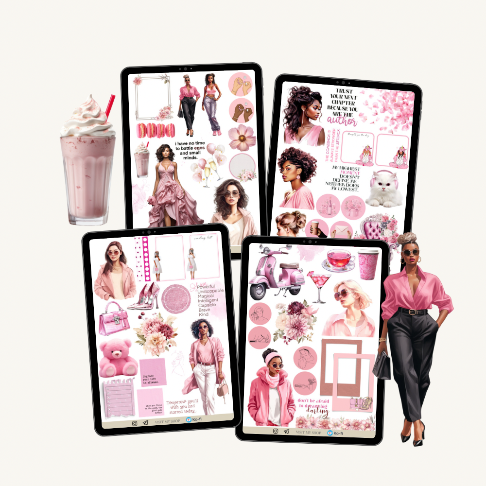 4 pages 66 pre-cropped pink stickers with beautiful girls, icons, quotes and pretty decorative elements.
