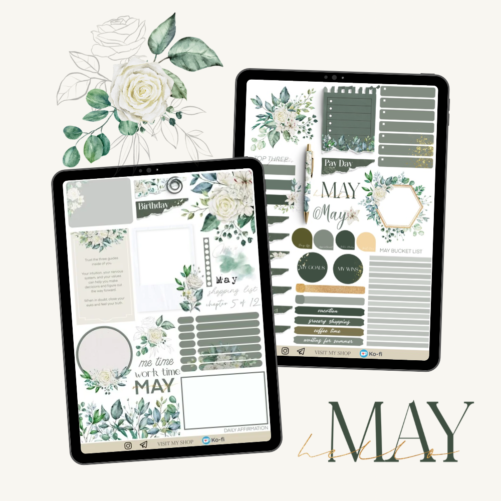 2 pages 50 pre-cropped sage stickers with white watercolor roses, decorative and functional elements