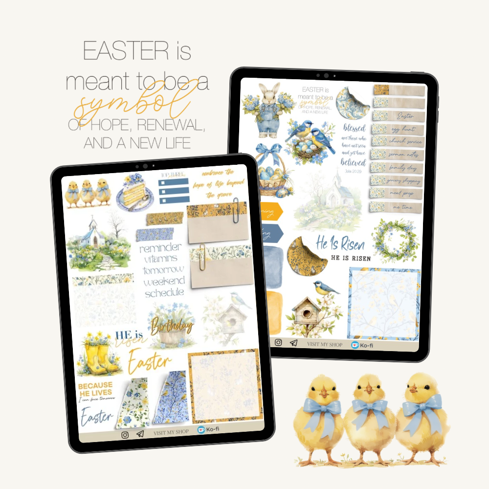 2 pages 54 pre-cropped blue and yellow Ester stickers with decorative and realistic paper elements