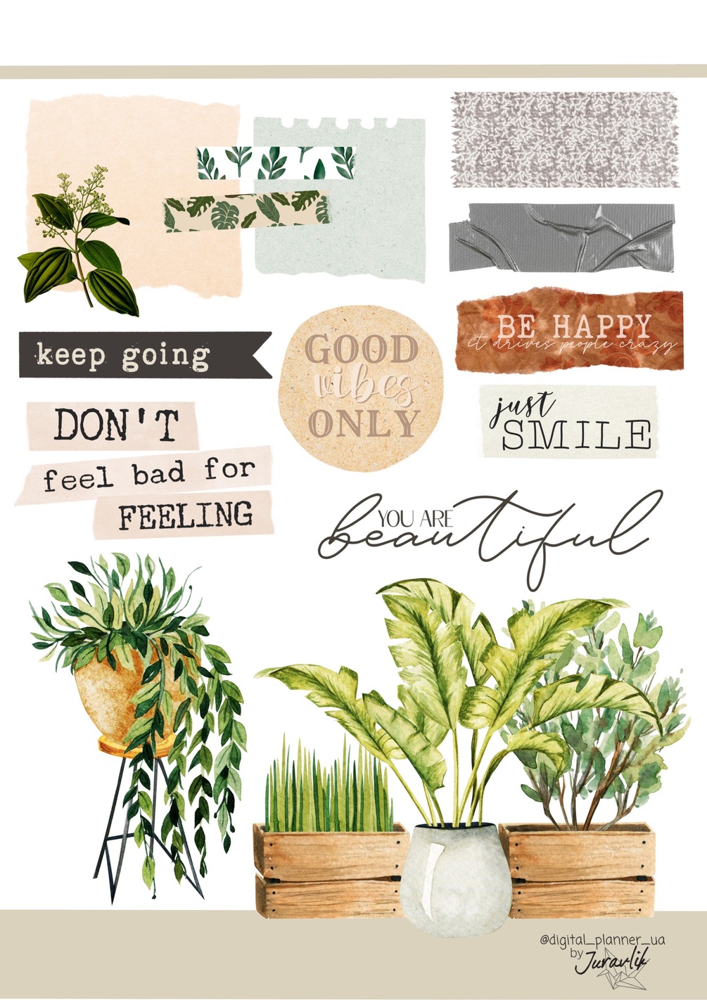 3 pages 38 pre-cropped watercolour plants, torn paper, washi tapes, leaves and positive quotes stickers, GoodNotes ONLY