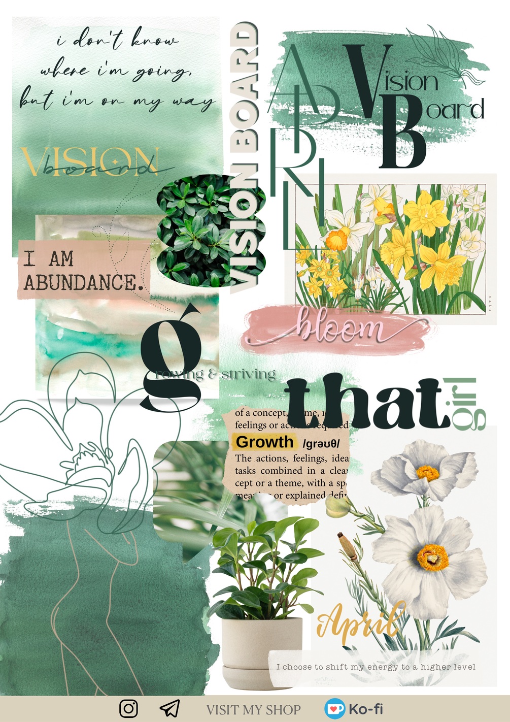1 page 25 pre-cropped spring-themed stickers with retro flowers, Green brush strokes, motivational quotes, April and Vision Boars labels etc. GoodNotes ONLY