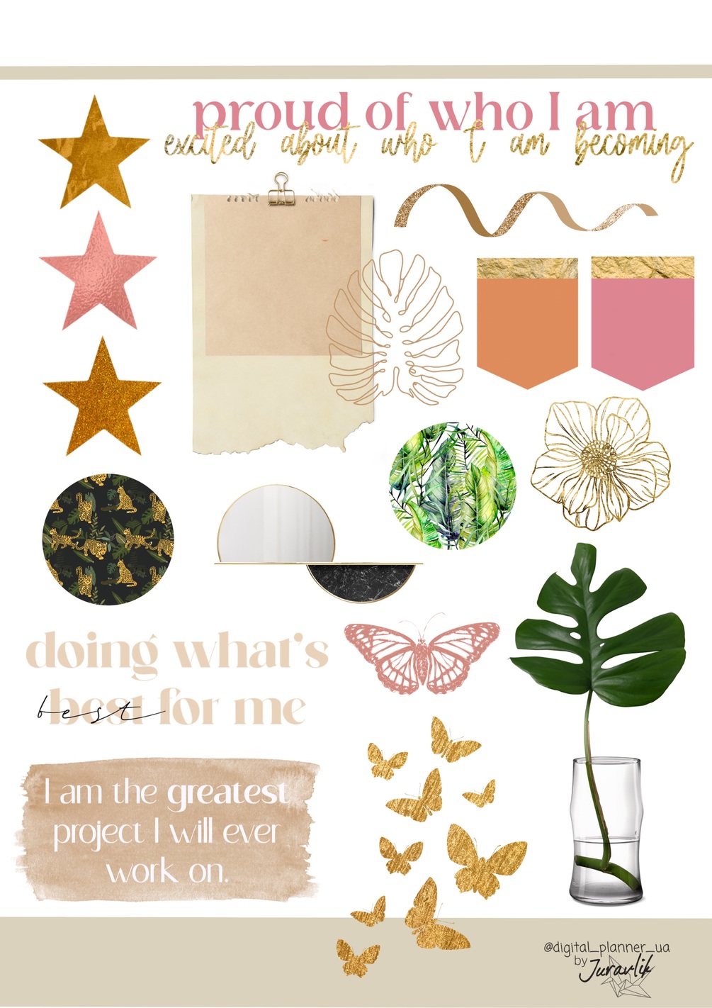 2 pages 33 pre-cropped beige, pink and gold stickers with motivational quotes, circles and monstera leaves, GoodNotes ONLY