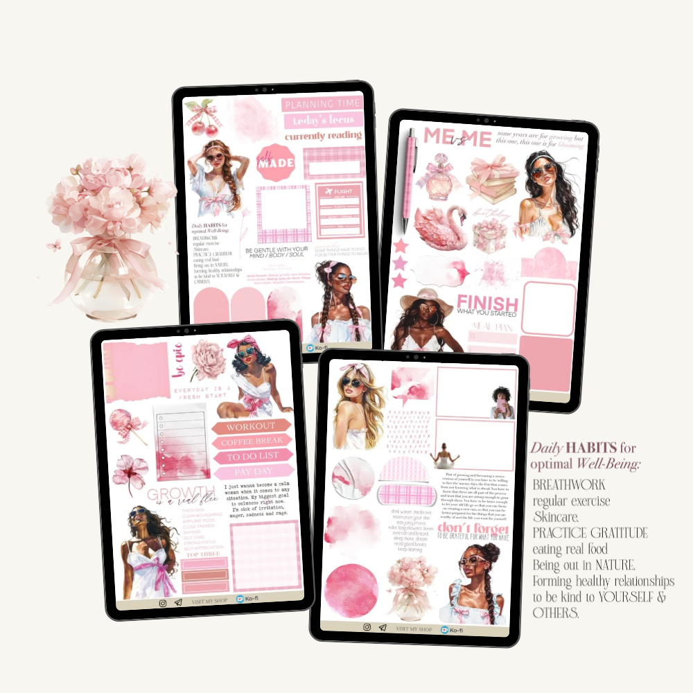 4 pages 68 pre-cropped pink stickers with girls, quotes, decorative and functional elements.