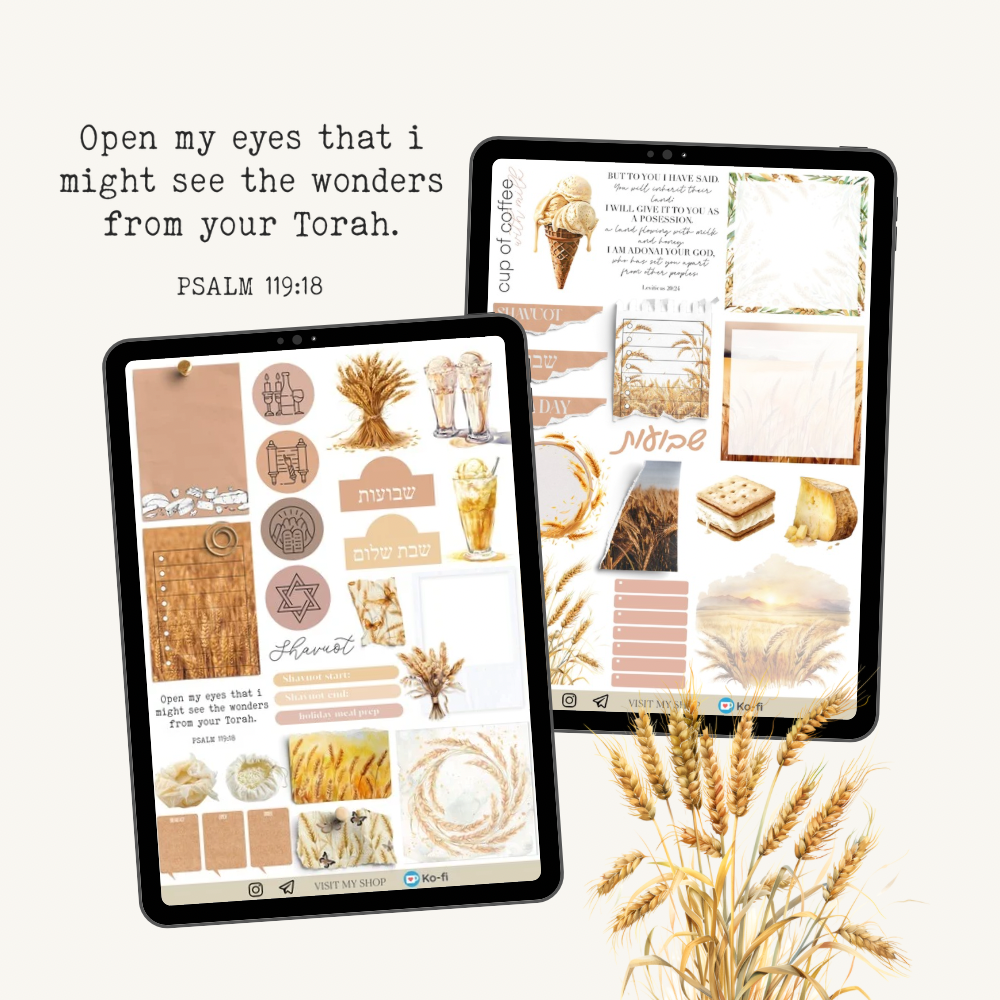 2 pages 42 pre-cropped Shavuot stickers with wheat and ice cream, paper notes, icons and labels.