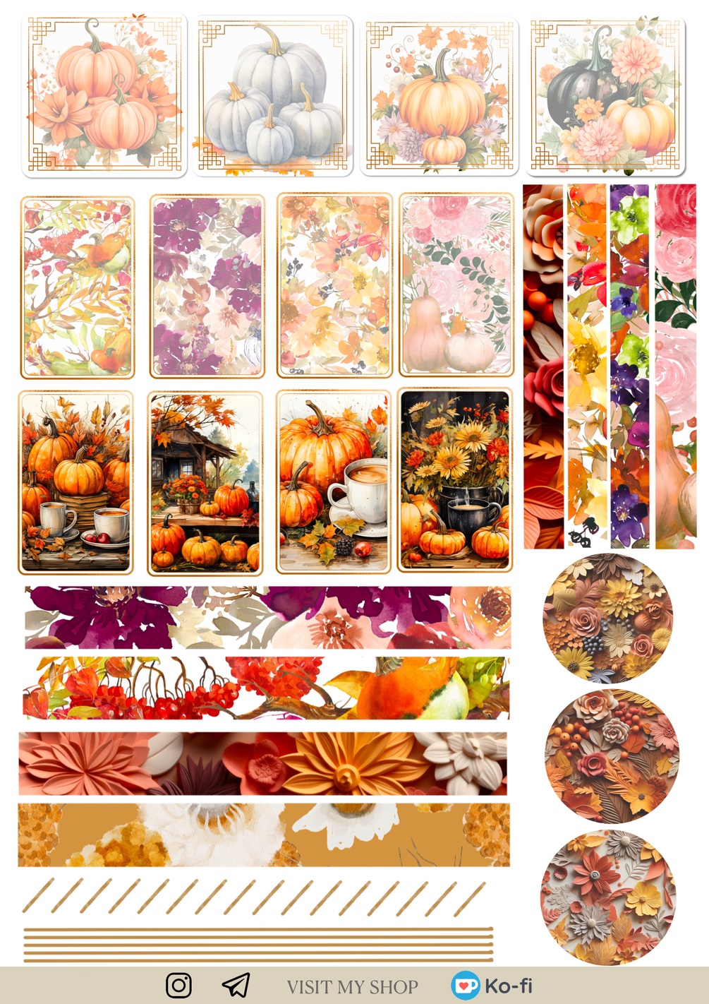 165 pre-cropped fall decorative elements, realistic paper, labels, icons, borders and cards stickers, 4 pages GoodNotes file and NOT separated PNG with transparent background.