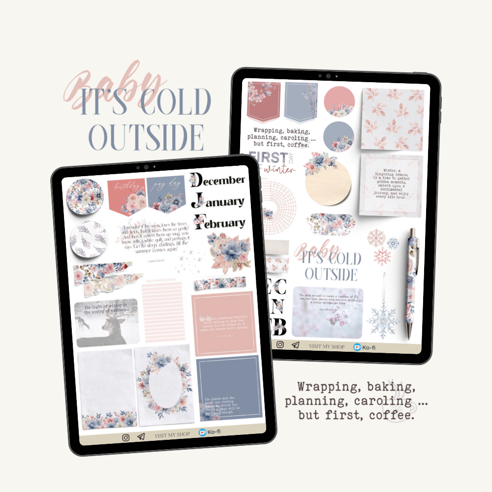 2 pages 40 pre-cropped pale rose peach and light blue winter stickers with paper notes, quotes, labels and snowflakes.