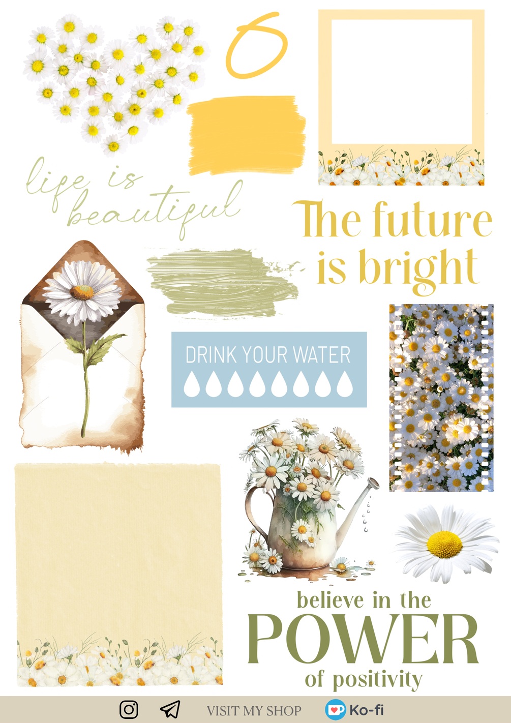 3 pages 55 pre-cropped decorative and functional bright summer stickers with daisies. GoodNotes ONLY