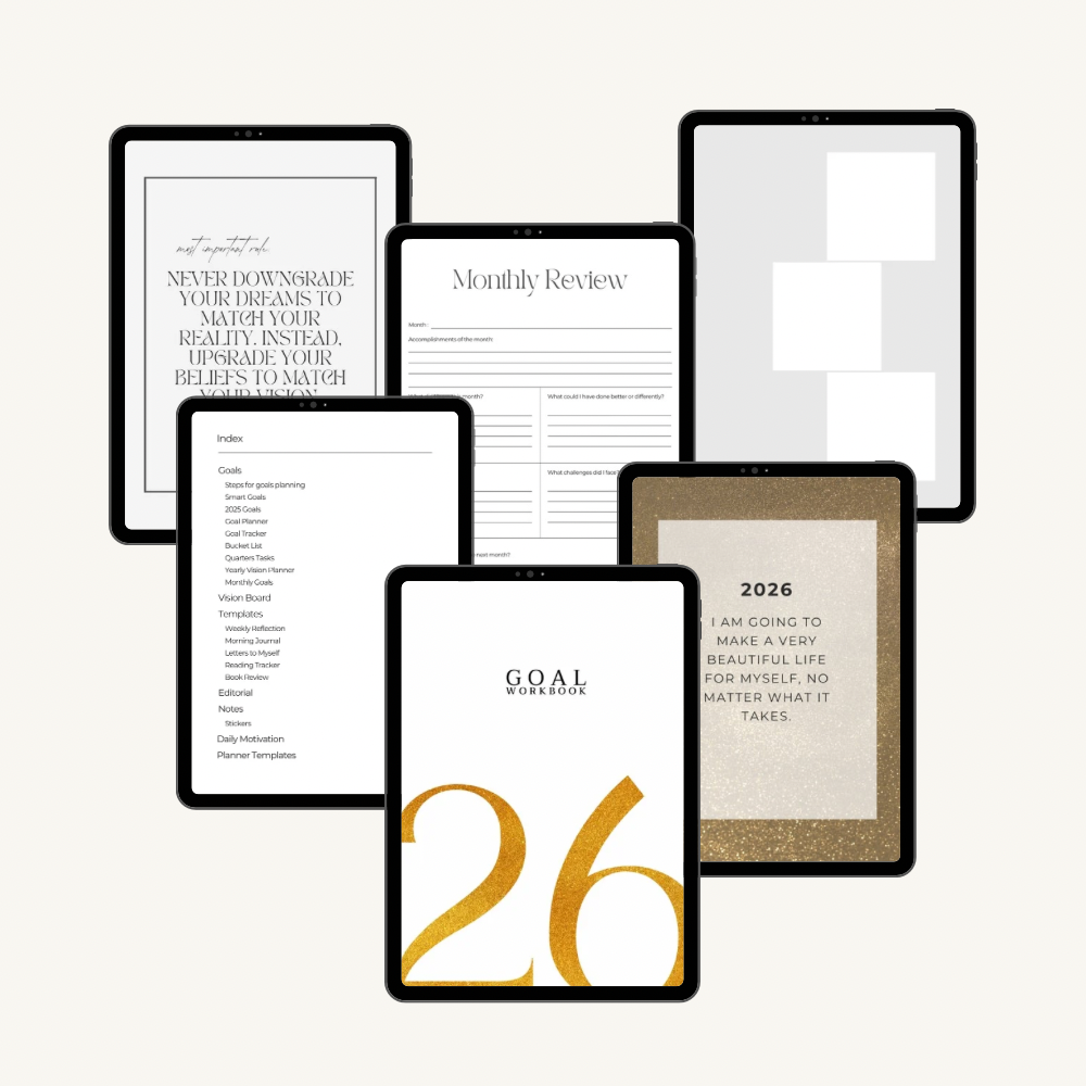 Goal Getter Workbook (PDF) includes 150 pages with goal and planner templates, editorial templates, motivational quotes and divider.
