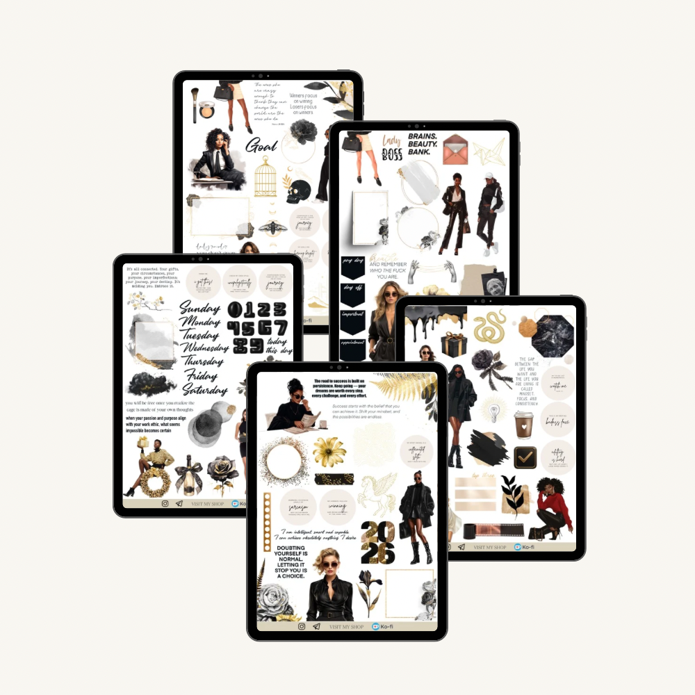Goal Getter Vol.3 sticker set includes 5 pages 120 stickers with girls, black and gold elements, quotes, labels, functional and decorative elements.
