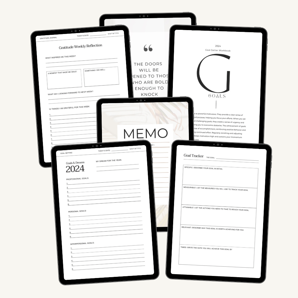 Goal Getter Workbook, 34 pages: cover and 33 different goal and planning templates, goal planning tips and motivational quotes. Not linked PDF. You can add templates to your planner.